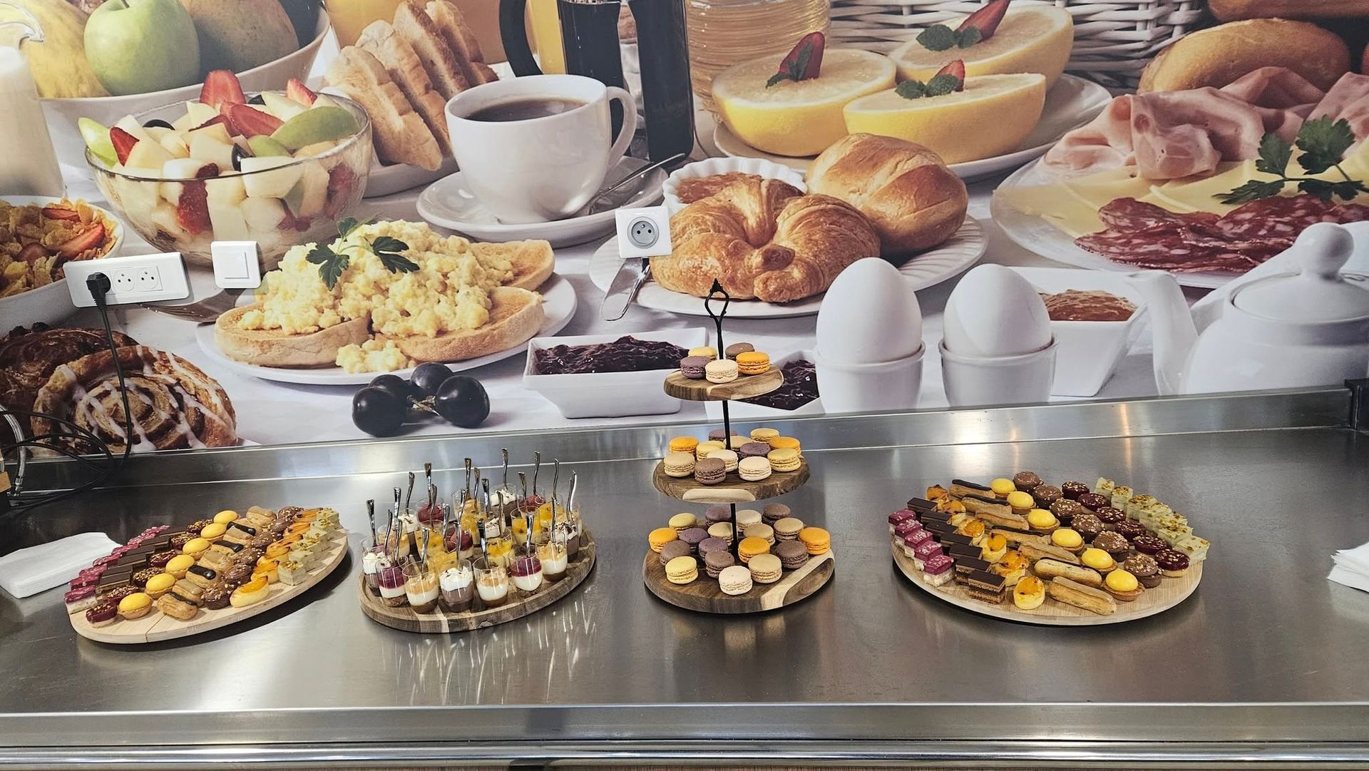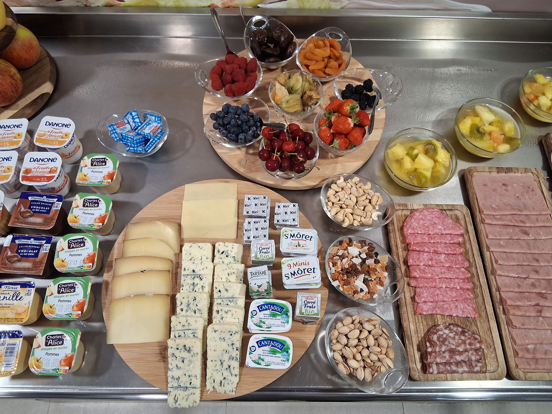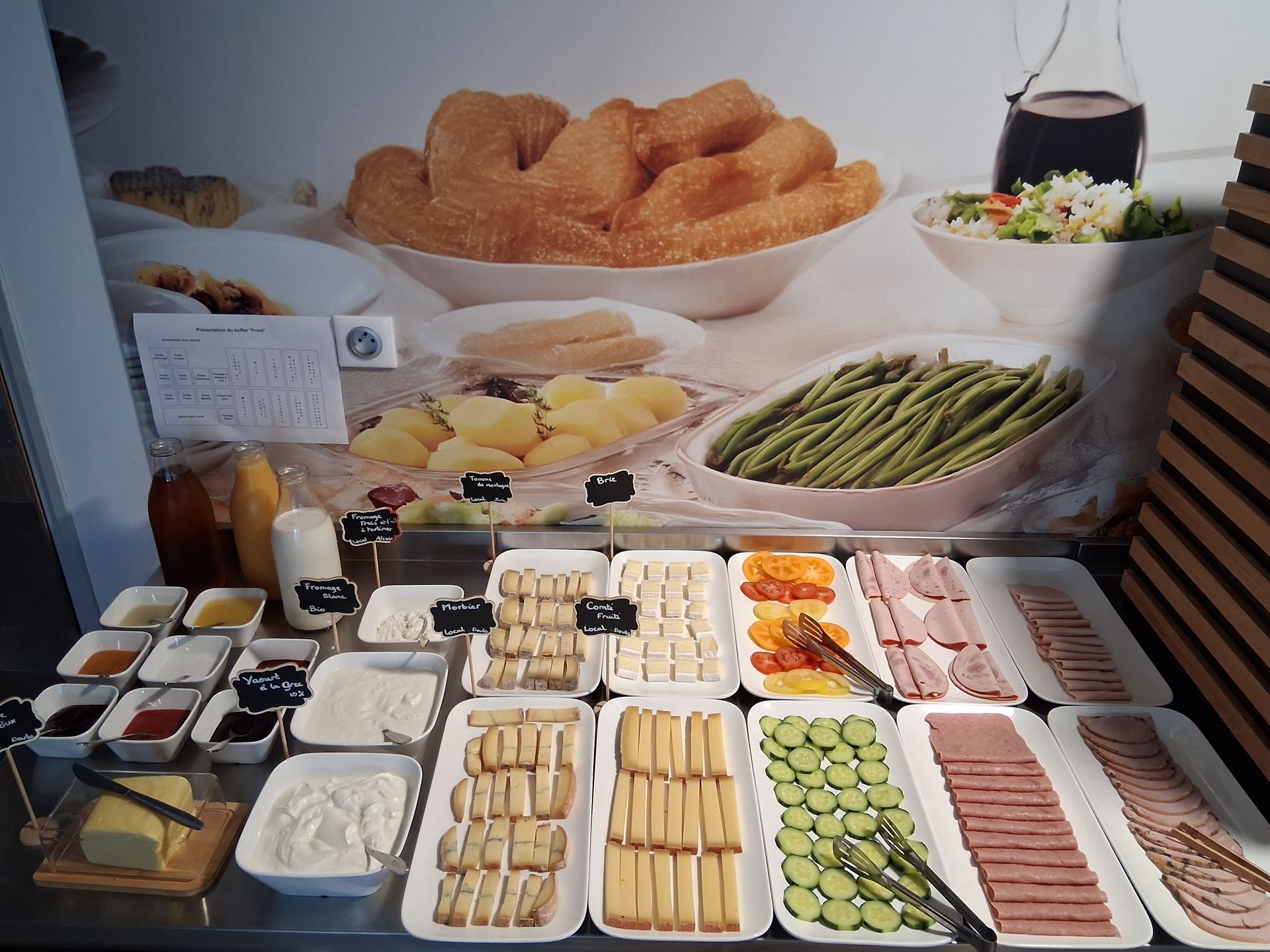 Petit déjeuner buffet varié avec propositions sucrées, salées, sans gluten. Spécialités locales et/ou Biologiques